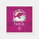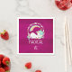 Pappra servetter med humoristisk design. En sovande uncorn med finare mane och svan. Dekorerad med en trio stjärnor. Ett regnbåge med båge. En cirkulär andedräkt bestående av moln, hjärtan och blommor för ytterligare giftigt mjöl. Typografi säger Magic AF. Humoristisk och söt. Bakgrunden är en mörk magenta rosa cerise färg.