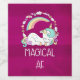 En flaska-märkning med humoristisk design. En sovande uncorn med finare mane och svan. Dekorerad med en trio stjärnor. Ett regnbåge med båge. En cirkulär andedräkt bestående av moln, hjärtan och blommor för ytterligare giftigt mjöl. Typografi säger Magic AF. Humoristisk och söt. Bakgrunden är en mörk magenta rosa cerise färg.