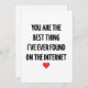 Send your love in the most modern and heartfelt way with this Valentine’s Day card featuring the quote “You're the best thing I've ever found on the internet.” Perfect for couples who met online, long-distance love, or anyone whose favorite person came from a screen and became real. This card is cute, funny, and romantic all at once—ideal for Valentine’s Day, anniversaries, or just because. Add your own personal message inside to make it extra special!