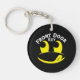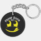 Looking for a fun way to identify your keys? This playful keychain features a bold, bright yellow smiley face with mischievous winking eyes and its tongue sticking out, all set against a classic black background.