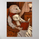 L'image montre une scène chaleureuse de deux furets, un adulte et un jeune, assis dans un fauteuil en bois. Le furet adulte, portant une écharpe rouge et blanche, tient un grand livre à reliure rouge, tandis que le plus jeune, portant des lunettes, est confortablement assis sur ses genoux. La pièce est faiblement éclairée par une lampe posée sur une table d'appoint, projetant une lueur chaleureuse sur la scène.