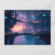 Futuristic cityscape with towering structures and interconnected platforms, reflecting in a body of water. The color palette is dominated by blues and purples, with hints of orange and pink from the setting sun. The city is illuminated with numerous lights, creating a vibrant and dynamic atmosphere.