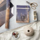 The image showcases a futuristic cityscape rising from a desert landscape. Tall, modern skyscrapers with reflective surfaces dominate the horizon, illuminated by a warm, golden light. The foreground features sand dunes with subtle ripples and a body of water reflecting the city's skyline. The sky transitions from a deep blue to a soft, pastel hue near the horizon.