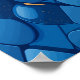 En modern abstrakt design med 3D-geometriska former i olika former, inklusive cirklar, fyrkanter och rundade rektanglar. Bilderna användor glansa blå toner med reflekterande högdagrar, accentuerade med gyllene glasögon och mjuka orangar från vissa inslag, skapande en futuristiska och en dynamisk visuell effekt.