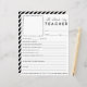 En roligt lärares uppskattningsplikt i slutet av skolåret till ge är ett tack till läraren. Det här och allt om min lärare fyller i det tomma brev med utrymme för ditt barn till skriva för hand och en tom pil för skriva eller rita in något. Lärarens brev-gåva är en randig vit och svart gåva. Det här skulle göra en söt lärare till keepy. Ta en titt på min lärarpresentsamling för fler idéer.