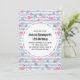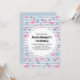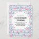 Födelsedagsinbjudan med ett mönster med en rolig sommarstämning. Rosa flamingos och ananas på ett ljust blått randigt mönster med blad och hjärtan runt omkring.