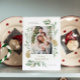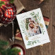 Julhälsningskort med anpassningsbar. Elegant grönt botaniskt löv och guld blomma ram med vit bakgrund och GLAD HELG elegant typografi. Baksidan och framsidan har foton från lagrar som måste ersättas med dina egna.