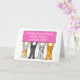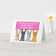 Fyra tecknader katt som bär rosa rosett band håller upp ett stort rektangulärt tecken på rosa som säger "Grattisar fyra år utan cancer". Bilden ställs in mot en vit bakgrund.