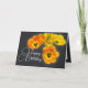 Ett häftande närfoto av fyra gult- och orange-tulpaner mot grått-bakgrund. Blommorna täcker framsidan av det här tomma kortet för blommigt som kan användas som ett tackkort, ett födelsedagskort eller något annat kort som du väljer. Anpassa den med texten och/eller bilder för att göra den till en sorts!