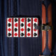 Kortsikoner i kostym som är isolerade på svart, röd och vit strimlad bakgrund