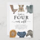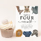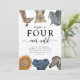 Kute- och roligt-pojkens safari-djur Tema 4e födelsedagen-inbjudan med illustration av safaridjur av giraffe, snö leopard, rhino, lejon, elefant och zebra. I texten står det: "XX är FYRA vilder."