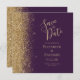 Det moderna bröllop spara datum-kortet från elegantens lämnat kant har ett guld faux glitter gräns. Anpassadet kombinerar handskrift, rityta och kursivt typsnitt med guld-färgad på mörkens lila-bakgrund. Den omvända sidan har en matchande lila- och guld-design.