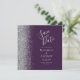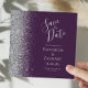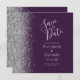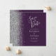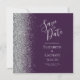 Det moderna bröllop spara datum-kortet från elegantens lämnat kant har ett silver faux glitter gräns. Anpassadet kombinerar handskrift, tryckplåt och kursivt typsnitt på mörkens lila. Den omvända sidan har en matchande lila- och silver-design.