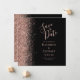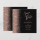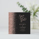 Den vänstra kanten på detta eleganta moderna bröllop save the date-kort har en roséguld falsk glitterkant. Den anpassningsbara texten kombinerar blek roséguld rodnad färg handstil, kopparplåt och kursiv stil på svart bakgrund. Baksidan har en matchande svart och roséguld design.