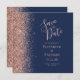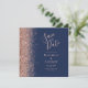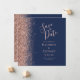 Det moderna bröllop spara datum-kortet från elegantens lämnat kant har ett faux glitter gräns i ro i guld. Anpassadet kombinerar handskrift, rityta och kursivt typsnitt med handstil för ro rosa på en marin blå bakgrund. Den omvända sidan har en matchande marin blå och ro guld-design.