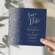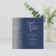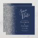 Det moderna bröllop spara datum-kortet från elegantens lämnat kant har ett silver faux glitter gräns. Anpassadet kombinerar handskrift, tryckplåt och kursivt typsnitt med silver grått på en marin blå bakgrund. Den omvända sidan har en matchande marin och silver-design.