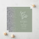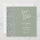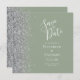 Det moderna bröllop spara datum-kortet från elegantens lämnat kant har ett silver faux glitter gräns. Anpassadet kombinerar vit handskrift, tryckplåt och kursivt typsnitt mot bakgrund av grönten. Den omvända sidan har en matchande sidstorlek och silver-grönt.