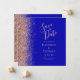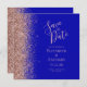 Det moderna bröllop spara datum-kortet från elegantens lämnat kant har ett faux glitter gräns i ro i guld. Med anpassadet kombineras handskrift i färgaden ro i blek guld, teckentabell och kursiv typsnitt i royalets blå bakgrund. Den omvända sidan har en passande utformning av royalet blue och ro guld.
