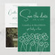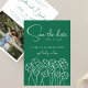 Framsidan på detta stilrena kort har den vackra smaragdgröna färgen och texten "Spara datum" i modern handskriven kalligrafi med en vacker bukett vilda fyrklöver, i vitt. Baksidan innehåller den enkla informationen, parets namn, ett datum och ert favoritfotografi från förlovningen. Detta kort kan enkelt anpassas via knappen "Anpassa". Skicka gärna ett meddelande till mig om du har några frågor eller önskemål om anpassning, jag hjälper dig gärna! Observera att jag inte kan ändra eller påverka en befintlig beställning. Bläddra bland min Smaragdgröna bröllopssamling för fler inbjudningar och andra matchande produkter som inbjudningar, gummistämlar, svarskort och mycket mer!