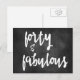 NewParkLane - Modern svart-vit postkort med rolig text 'Fyrtio & Fantastisk' i modern scripttypografi på en kalkstavbakgrund.