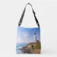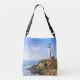 Fyrtorn på det vita huset backe blå himmel, där havet vågar kraschar in i sten.