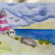 Fyrtorn och stuga på strandlinjen. Dyster himmel, topas vatten. En fantasifull akvarellmålning inspirerad av Happisburgh, Norfolk