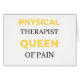 Fysisk terapeut drottning av smärtstillande utformning. Detta är ett roligt citat från kort som är underbart som en uppskattande gåva till fysikterapeuter. Lämplig som fysikterapigåvor.