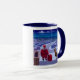 Santa tittar ut över en stor stad som betraktar därför han är i denna fodrar av arbete.