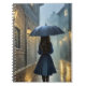 Kvinna från baksidan, med paraply i regnet i en gammal gränd, på natten med gamla glanslampor