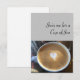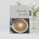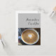 Bild av cappuccino på grått-bakgrunden med ord "Gå med mig för Kopp av Joe". Tom på baksidan för ditt meddelande.