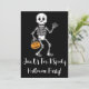 Gå med oss för ett Halloween fest. En underbar inbjudan till vilken Halloween fest som helst. Den har en tecknad, ett vänligt skelett som håller en väska i bus eller godis.