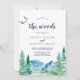 Detta går med oss i skogen inbjudan till bröllopsbröllop är perfekt för ett utomhusland bröllop. Utformningen har ett blått och grönt målat vildmarkslandskap med vattenfärgen gräs träd, fåglar och berg.