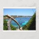 En vacker scenvy längst upp i backe, innan man går ner till den pikresska stranden i Menorca i Spanien. Detta är en av Balearerna. Klar blå vatten, grönt löv och ett soligt himmel!