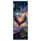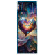 A luminous heart-shaped object glows at the center, surrounded by vibrant cosmic swirls. Small spherical orbs add depth to the celestial scene.