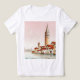 The watercolor painting depicts the Galata Tower in Istanbul, Turkey. The tower rises above the houses of the old city, and the moon is visible in the background. The painting is painted in a delicate and romantic style, with soft shades of pink and orange.