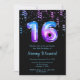Den här eleganten och den glamorösa födelsedagsinbjudan har nummer 16 i galaxutskrift med lila och blå konetti. Texten kombinerar handskript och modernt sans serif typsnitt för ett klassligt och sofistikerat utseende.