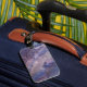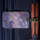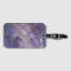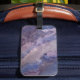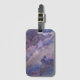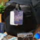 Bagagetagg med blå och lila galaxi med spridda vita stjärnor. Originalteckningen av Ray Bean är vattenfärgen på vattenfärgens papper.