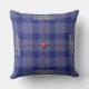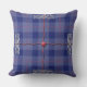 Vi kallar den ursprungliga designen av HomeWare på denna 20” kudde för “Mad Plaid in Blue”. Mönstret är en grundläggande ruta i nyanser av heatherblått. Över denna bakgrund löper två vågiga röda linjer, en horisontell och en vertikal, som korsar varandra i mitten av designen. Linjerna är tredimensionella och kastar skuggor på rut-mönstret, och det finns en rund röd knapp i mitten där linjerna korsar varandra. Över de yttersta ändarna av de röda linjerna, på fyra sidor, finns block med strukturerade, vågiga vita linjer. Det finns också röda prickade linjer som löper genom den ljusare blå delen av rutan. Det ser lite ut som ett paket, allt förseglat och tejpat. Därav namnet "Mad