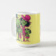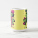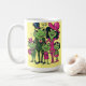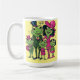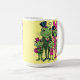En gult kaffe Mugg som bär bilder av Crazy Frog och hans familj, i grönt och rosa färg, en rolig tecknad för familjen och barnen, för att dekorera den matande bord, för att dekorera köket och för älskare av Crazy Frog äventyr