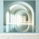 Ein ruhiger architektonischer Raum, geprägt von weichem Licht, klaren Rundbögen und stiller Symmetrie. Hohe Öffnungen lassen diffuses Tageslicht einfallen und erzeugen langgezogene Reflexionen, die den Blick durch die Galerie führen. Die gedämpfte Farbigkeit und die präzise Geometrie verleihen dem Motiv eine kontemplative, klare Präsenz — perfekt für Räume, die Minimalismus und eine feine architektonische Atmosphäre schätzen.