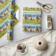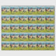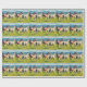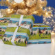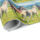Två hästar, en röd, en vit, gallopande över en ängsskugga.