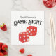 De här party-napkins i anpassningsbar har ett tema för spelnatt. En bild av uppspelningsfärgen skrivs ut i mitten i en röd glitter-design. Uttrycket "Spelnatt" trycks ovanför tärningen med en exempelfamilj namn. Du kan anpassa blöjorna så att de innehåller ditt eget namn eller egen text.