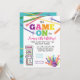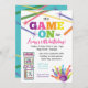 Vår ursprungliga, bäst säljande Game On Arkad Bowling födelsedagsfest inbjudan är den perfekta inbjudan för alla speltemafester med ett arkad, lasertagg eller bowling tema. Denna design har färgglada bokstäver med roliga arkadspel, bowlingklot och käglor, och laserstråle grafik.