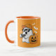 This fun graphic features a cool ghost wearing a baseball cap and sunglasses, holding a video game controller, and chilling next to a grinning jack-o'-lantern. Surrounded by bats, this mug is the perfect way to show off your love for gaming and Halloween while sipping your favorite beverage.