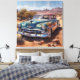 målning av en gammal blå, övergiven bil i öknen
