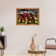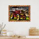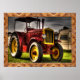 Denna vintage traktor har en gammal brunsttäcke i tak på den. Med gamla gult metall-fälgar.Kroppen är röd och frontgallret är gult.Du kan se grått-molnen och grönt-gräs.Den här poster har ett trä golv ram.