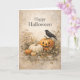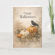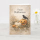 En mjukt åldrad, vintageinspirerad halloweenillustration med en lugn, höstlig stämning. En utskuren jack-o'-lantern och ärvda pumpor i dämpad elfenben och varmt orange vilar bland torra gräs, vete och nedfallna löv. En ensam svart kråka sitter på toppen av pumpen och ger en tyst hint om mystik utan hot. Den återhållsna "Happy Halloween"-typografin och pergamentliknande bakgrunden frammanar antika tryck och gamla skördekort, vilket gör denna design perfekt för dem som föredrar ett subtilt, elegant och rustikt tillvägagångssätt för Halloween.