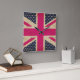 En illustrerad grafisk design av en gammal Union Jack Flagga i skuggor av rosa och vitt mot bakgrund färg av mörk blått med vita hjärtan som passar för alla azzelprodukter.