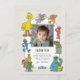 Det här är en Sesame Street-tackkortsmall i vintage-stil, perfekt för ett barnkalas. Kortet har en central, fyrkantig yta för ett personligt foto av en baby eller ett barn. Runt fotot syns en glad kast av klassiska Sesame Street-figurer. Designen har en subtil, neutralfärgad bakgrund som ger den en klassisk, tidlös känsla. Under fotot finns ett personligt tackmeddelande som lyder: "TACK. Jag älskade tårtan och alla presenter, men det allra bästa var att fira med ER! Tack för att ni gjorde min födelsedag så speciell! Den övergripande stilen är nostalgisk, söt och perfekt för ett första födelsedagsfirande eller någon ung barns firande.