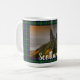 Scenia mugg har ett foto av Gamle Man of Storr sten på Isle of Skye med stort "Scotland"-textöverlägg. Bakgrund är Klan Sutherland tartan mönster